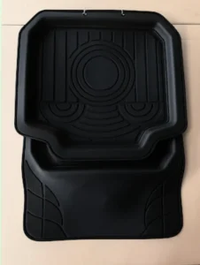 Un tapis de sol noir 🚗 est présenté sur un fond blanc. Il possède des bords surélevés 🛡️ pour retenir les débris. Le centre arbore un motif circulaire 🔘 et des rainures pour piéger l’eau et la saleté 💧. La partie inférieure du tapis est plus large et texturée, offrant une meilleure adhérence. Sa couleur noire uniforme lui donne un aspect pratique et facile à nettoyer. Ce tapis est conçu pour protéger l’intérieur de votre véhicule avec style 😎 et efficacité.